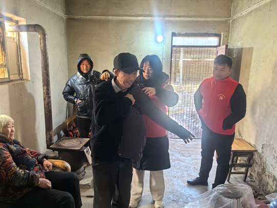 在朱固村残疾人李大姐的农家小院里,志愿者将棉衣穿到她身上,还细心帮她比画尺码:“您试试这件,大小不合适我们再给您换。”李大姐摩挲着厚实的棉衣面料,连连道谢:“谢谢你们想着我,这棉衣看着就暖和!”而在孤寡老人张大爷的屋里,志愿者俯身帮老人套上棉衣,拉好拉链,又帮助老人整理好衣领,老人一边感受着棉衣的温暖,一边拉着志愿者的手唠起家常,屋内的欢声笑语驱散了冬日的寒意。