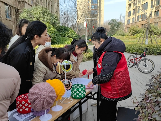 义卖展架前,围满了前来挑选心仪好物的居民,他们不时发出啧啧赞叹:“这玩偶胖乎乎的真可爱!”“小发卡太别致了!”“我要挑个手提包,又大方又美观。”现场还有实用的杯套、暖融融的绒线帽……这些都出自社区里一群心灵手巧的“织梦人”之手,她们把美好的祝福都钩进了毛线里,钩进了一个个作品里。如今,这些钩织小物被义卖,众人同酬岁寒之谊,同享奉献之乐。