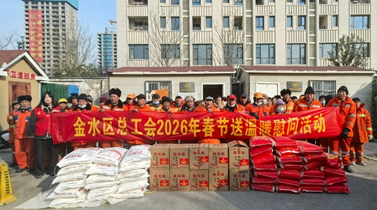 大河网讯 寒冬辞旧岁,温情迎新春。在2026年春节来临之际,郑州市金水区总工会与北林路街道工会联合会携手,面向辖区60名环卫工人、40名快递小哥及2名建会企业困难职工开展了春节前慰问活动,以统一发放的米、面、油慰问品为纽带,将工会的深切关怀送到每一位一线劳动者心坎上。