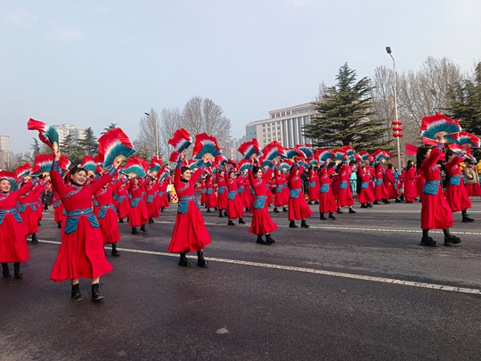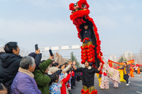 活动现场,彩旗招展,锣鼓喧天。由350人组成的狼城岗镇方阵率先登场,舞龙队伍手持长龙,凌空飞舞,寓意着风调雨顺、五谷丰登;雄壮的醒狮队伍闪展腾挪,时而威武雄壮,时而憨态可掬,引来阵阵喝彩。紧随其后的各类民俗表演方阵各具特色,既有展现传统文化的秧歌、旱船,也有充满生活气息的花篮担、大头娃娃、扇子舞。演员们身着盛装,踏着欢快的鼓点,将最质朴的祝福传递给沿途的每一位观众。