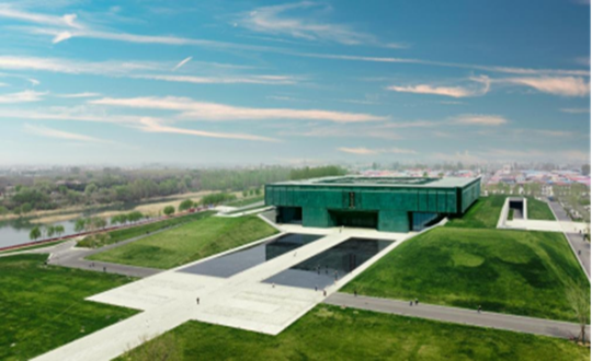 殷墟博物馆新馆位于安阳洹水之滨,毗邻殷墟宗庙宫殿遗址,是黄河国家文化公园重点项目。博物馆以《诗经·商颂》为源,以“鼎”为设计意象,由何镜堂院士主持设计,抽象演变青铜方鼎元素,整体呈现四方之形,彰显殷墟“四方之极”的文化气度。