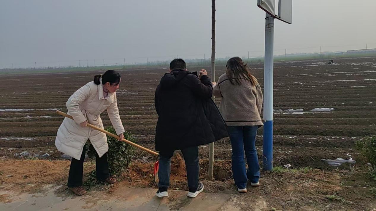 活动现场,一派热火朝天、干劲十足的繁忙景象。参与人员手持铁锹、水桶等工具,分工明确、配合默契,严格按照“挖坑、放苗、扶正、填土、踩实、浇水”的规范流程,有条不紊地开展植树作业。党员干部带头冲锋在前,挥锹铲土、扶苗培土,充分发挥先锋模范作用;农办工作人员现场指导,耐心讲解杜仲树、红叶石楠球的种植技巧和养护要点,确保每一棵树苗都能扎根沃土、茁壮成长;志愿者们热情高涨,有的搬运树苗、有的扶正苗木、有的浇水灌溉,欢声笑语间,一株株新苗被稳稳栽种,一道道新绿在田间地头悄然绽放。