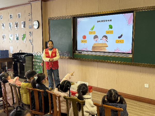 课堂上,色彩鲜艳的图片、水灵饱满的新鲜蔬果摆满了小课桌,长黑斑的香蕉、发芽的土豆、变质的四季豆等化身“反面教材”。大屏幕上,新鲜苹果与腐烂苹果的鲜明对比,瞬间吸引了孩子们的注意力。“烂苹果有细菌,吃了会肚子疼!”孩子们争先恐后地发言。工作人员用通俗的语言,结合发芽土豆、发霉面包等实例,耐心讲解辨别方法,引导孩子们树立健康饮食观念。