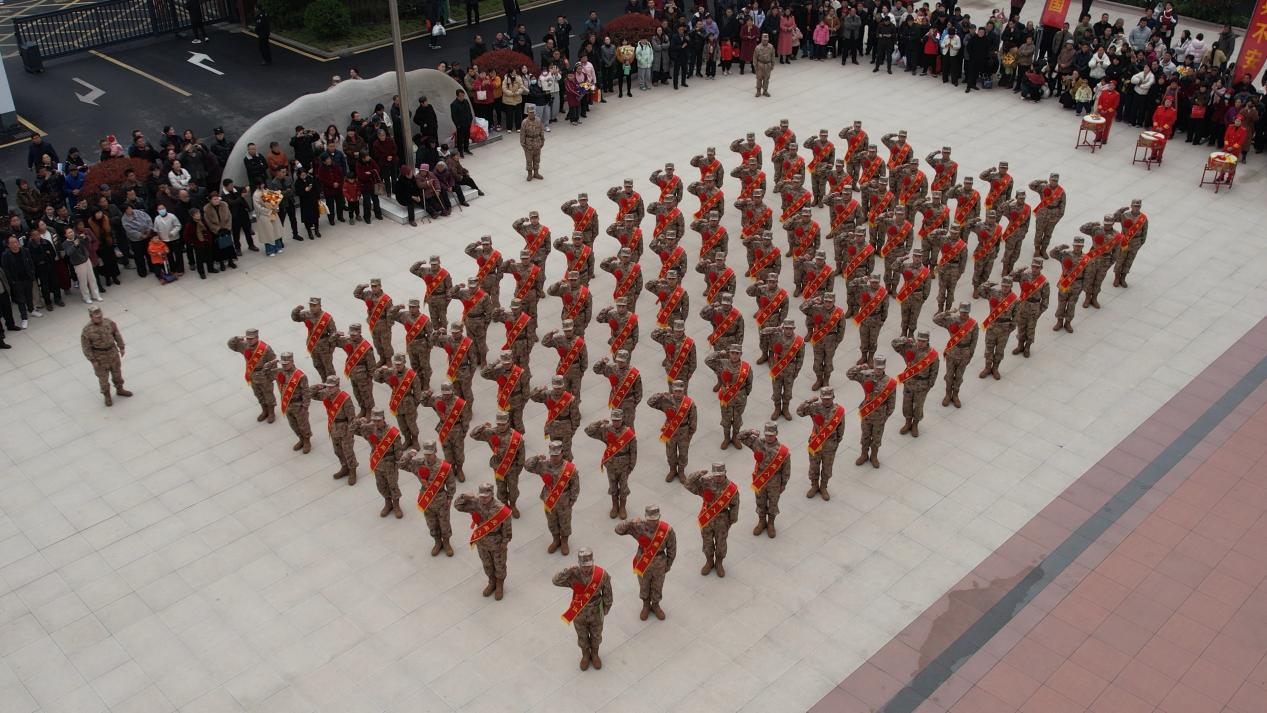 欢送仪式现场,军歌嘹亮,誓言铮铮。新兵们身着崭新迷彩服,肩披鲜红绶带,胸戴光荣花,目光坚毅,精神抖擞。