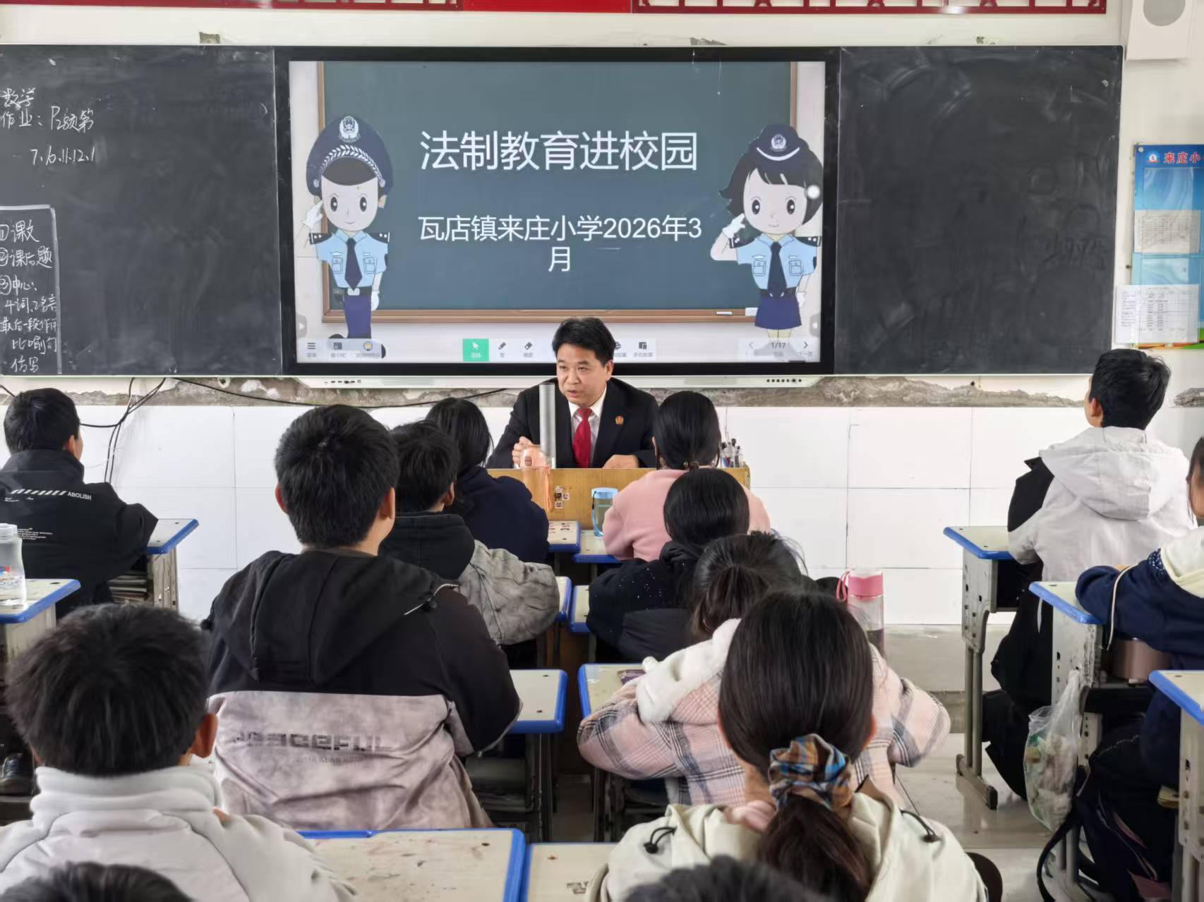 在瓦店镇来庄小学,该校法治副校长、宛城区法院立案庭法官邢万里结合中小学生身心发展规律,选取贴近校园生活的真实典型案例,通过案例剖析、场景讲解的形式,细致拆解各类危险场景,明确危险行为对应的法律后果,引导学生坚守安全底线、强化自我防护意识。另外,结合《中华人民共和国道路交通安全法》相关规定,邢万里讲解翻越护栏、违规骑行等行为的安全隐患与法律责任,引导学生牢固树立“文明出行、守法出行”的理念,从日常细节中规避出行安全风险。
