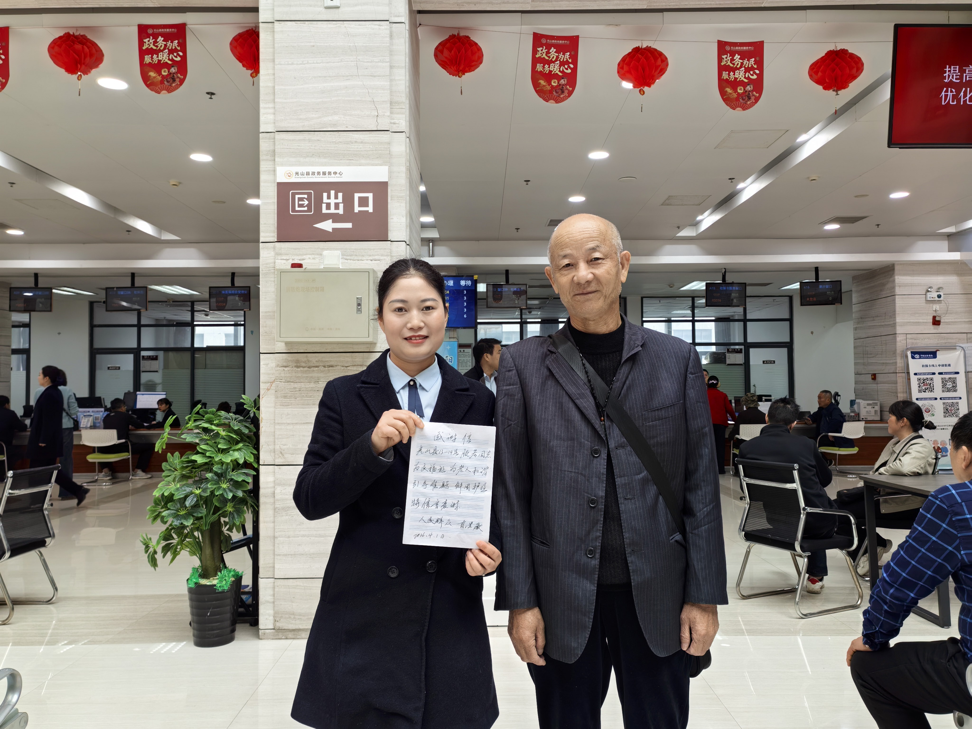 当日上午,甘先生与夫人走进光山县政务服务中心,在13-14号窗口办理异地就医备案。窗口工作人员以专业的业务素养和热情的服务态度,高效为其办结了业务。对比往年回乡经历,甘先生对家乡政务服务效率与态度的双提升深感欣慰。有感而发,老人提笔写下感谢信,信中称赞工作人员“为民福祉,为老人和谐,引导难题,解围护暖”,并引用毛泽东《卜算子·咏梅》中“俏也不争春,只把春来报。待到山花烂漫时,她在丛中笑”的名句,将默默奉献的政务服务人员比作高洁的梅花。