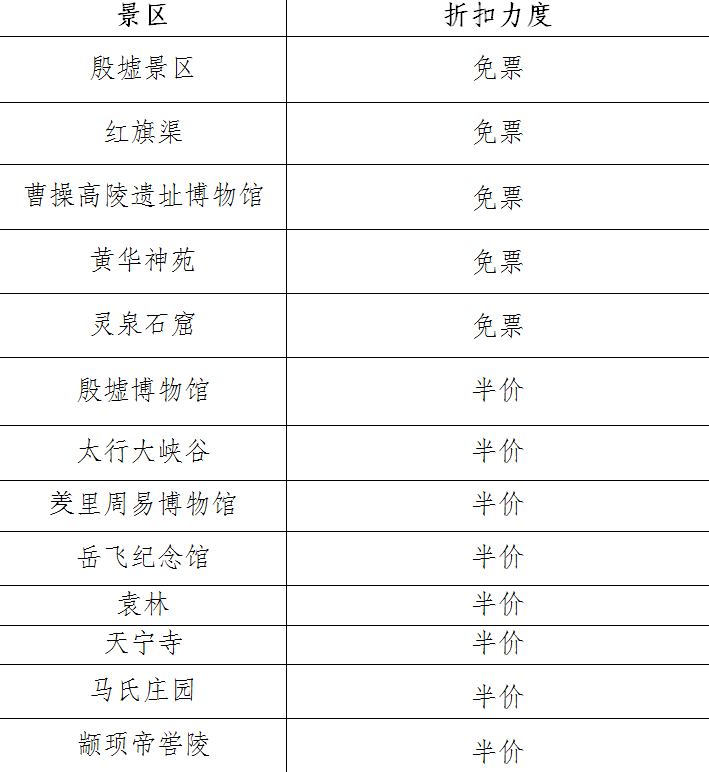 据悉,此次优惠活动时间为4月18日至7月31日(法定节假日除外),优惠涵盖殷墟博物馆、红旗渠、太行大峡谷、曹操高陵遗址博物馆、岳飞纪念馆等13家国有景区,全方位覆盖人文古迹、自然山水、历史遗址等文旅资源。